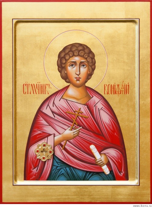 Святой мученик Вонифатий был рабом богатой молодой римлянки Аглаиды и состоял с ней в беззаконном сожительстве. Но оба они чувствовали угрызения совести и хотели как-то омыть свой грех. И Господь пожалел их и дал им возможность очистить грехи своей кровью и закончить грешную жизнь покаянием. Аглаида узнала, что если с благоговением хранить в доме мощи святых мучеников, то их молитвами легче получить спасение, ибо под их благодатным воздействием умаляются грехи и воцаряются добродетели. Она снарядила Вонифатия на Восток, где в то время шло жестокое гонение на христиан, и просила привезти мощи какого-либо мученика, чтобы он стал их руководителем и покровителем. Вонифатий на прощание, смеясь, спросил; «А что, госпожа, если я не найду мощей, а сам пострадаю за Христа, примешь ли ты мое тело с честью?» Аглаида отнеслась серьезно к его словам и укорила его в том, что он, отправляясь на святое дело, позволяет себе вольности. Вонифатий задумался над ее словами и всё время пути был сосредоточенным.