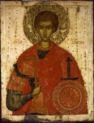 Тело святого великомученика Димитрия было выброшено на съедение диким зверям, но солунские христиане взяли его и тайно предали земле. При святом равноапостольном Константине (306-337) над могилой святого Димитрия была воздвигнута церковь. Сто лет спустя, при строительстве нового величественного храма на месте ветхого, обретены были нетленные мощи святого мученика. С VII века при раке великомученика Димитрия начинается чудесное истечение благовонного мира, в связи с чем великомученик Димитрий получает церковное именование Мироточивого. Несколько раз почитатели солунского чудотворца делали попытки к перенесению его святых мощей или частицы их в Константинополь. Но неизменно святой Димитрий таинственно проявлял свою волю остаться покровителем и защитником родных Фессалоник. Неоднократно подступавшие к городу славяне-язычники бывали отогнаны от стен Солуни видом грозного светлого юноши, обходившего стены и внушавшего ужас воинам. Может быть, потому имя святого Димитрия Солунского особенно почитаемо в славянских народах после просвещения их светом Евангельской истины. С другой стороны, греки считали святого Димитрия как бы славянским святым по преимуществу.