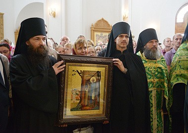 Архимандрит Тихон (Завьялов) приветствовал Святейшего Владыку и преподнес Его Святейшеству икону основателя обители преподобного Тихона Калужского.