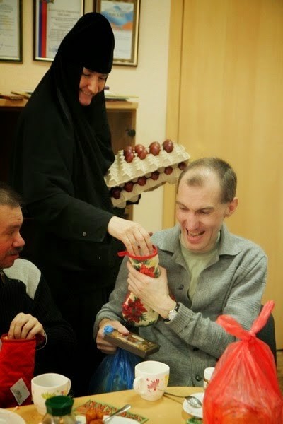 «Христос Воскресе!» – радостным приветствием встретили насельниц обители инвалиды-опорники общества «Надежда» в Паралимпийском комитете. Пропев хором пасхальный тропарь, все собрались за праздничным столом, украшенным освященными куличами и яйцами. Инокиня Фотиния прочла пасхальное поздравление духовника Введенской обители архимандрита Амвросия (Юрасова) и игумении Марии (Перепеча). К сожалению, не все инвалиды могут посещать храм, тем более ночное богослужение. Но теперь у них есть возможность смотреть трансляцию по телевидению. Большим утешением для людей с ограниченными возможностями оказалась привезенная из Иерусалима частичка воска, которым был опечатан вход в Кувуклию во время схождения Благодатного огня: все они с благоговением приложились к святыне. Затем последовали «пасхальная викторина», оживленный обмен рецептами приготовления пасхальных блюд, подарки. В завершение встречи председатель общества «Надежда» Нина Васильевна Семенова передала поздравления игумении Марии, Амвросию, всем священнослужителям, сестрам и отдельно монахине Иоанне – бессменному руководителю социального отдела Введенского монастыря.