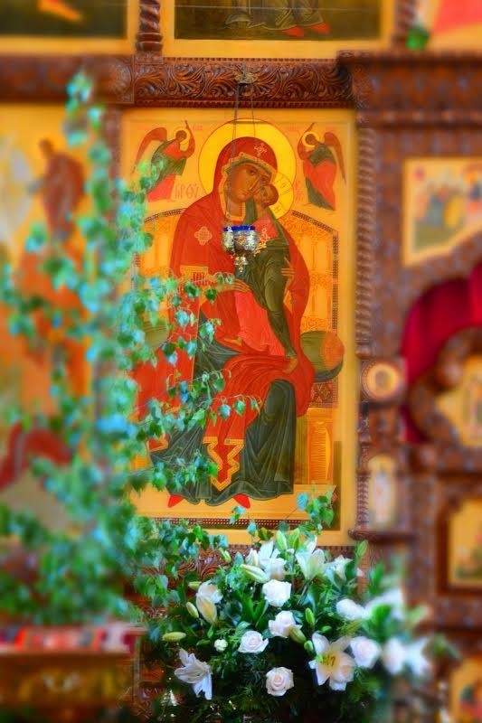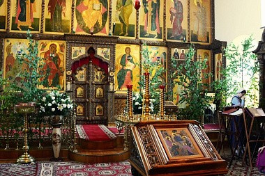 Накануне все приняли участие в украшении храма березовыми ветками и цветами. Было совершено праздничное Всенощное бдение.