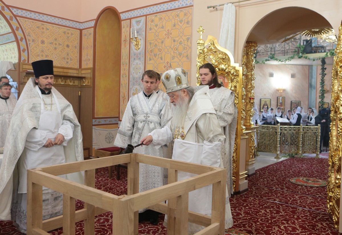 Владыка митрополит передал в дар монастырю икону преподобного Сергия Радонежского, выполненную древней техникой лицевого шитья, а также вручил высокие патриаршие награды семье Тягачевых. Его Святейшество удостоил Леонида Васильевича Тягачева ордена святого благоверного князя Даниила Московского I степени, а Светлану Николаевну — ордена святой равноапостольной княгини Ольги II степени. Также митрополичьи награды получили активные труженики и участники восстановления Спасского собора. От лица награжденных Его Высокопреосвященству была преподнесена икона Нерукотворного образа Господа Иисуса Христа.