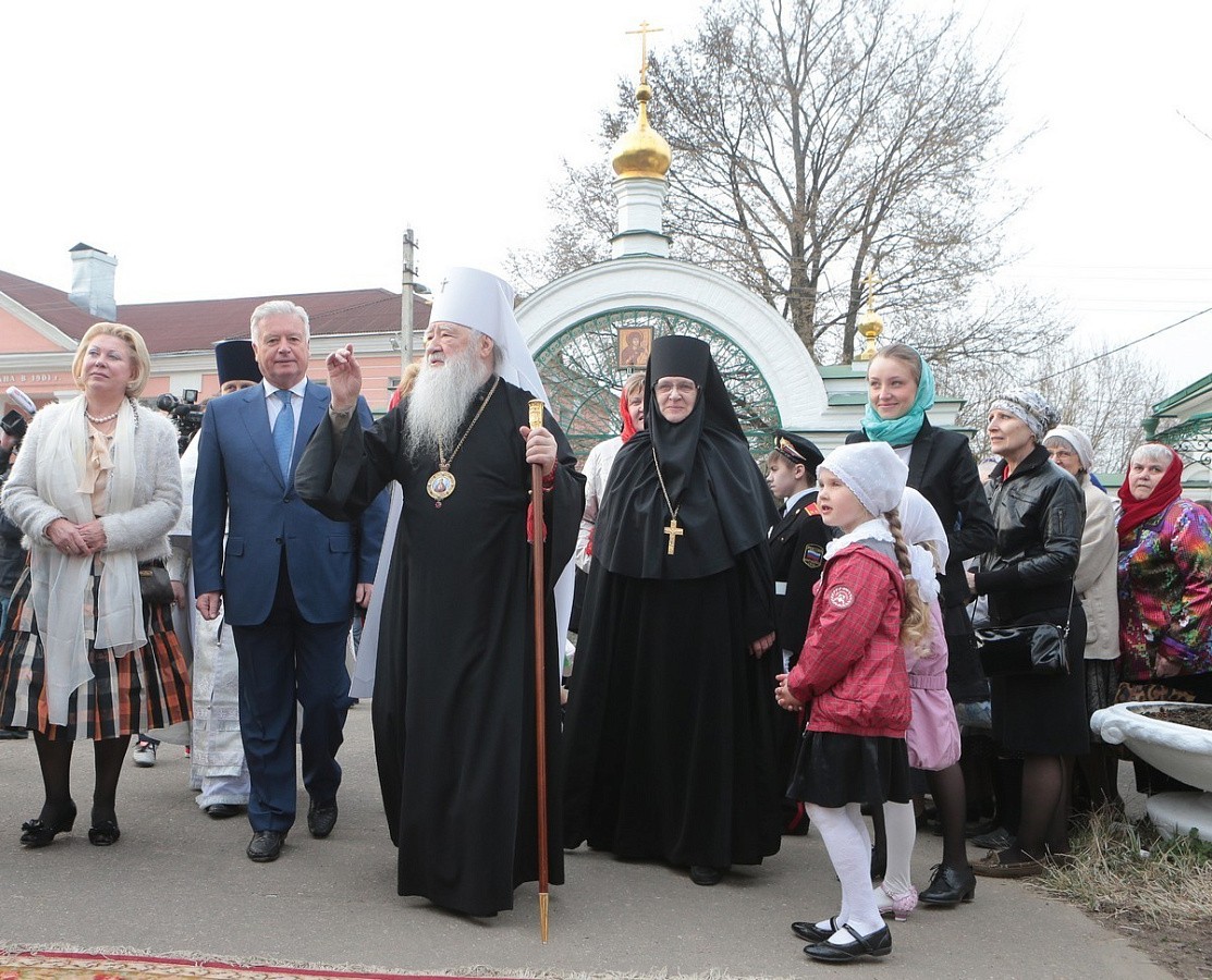В этот великий, ликующий праздник Пасхи Ваше Высокопреосвященство освятило сегодня наш собор Спаса Нерукотворного Спасо-Влахернского женского монастыря. История этого монастыря такова, что основание его очень древнее. Предки императорского рода имели очень огромное имение в этом монастыре. Они основали эту обитель, в монастыре было очень много икон которые были украшены драгоценными камнями, золотом и серебром. Монастырь в это время процветал, славился и ликовал, но пришли времена, когда он, к сожалению, был закрыт и пережил очень тяжелые времена: разграбление и в последствие закрытие. В 2001 году, наконец то, мы вновь обрели право, чтобы наш монастырь снова ожил, и началось его глубокое возрождение. И уже новый род наших других благодетелей, род Тягачевых, начал новый этап восстановления этой обители и возрождение этого собора. Разрешите в этот праздничный день поздравить Вас, Ваше Высокопреосвященство, и пожелать Вам доброго здравия в это Воскресение. Христос Воскресе!»