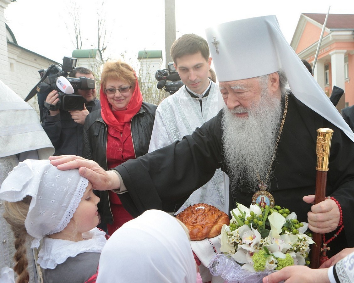 Я ни к кому сейчас не обращаюсь по имени, потому что перед престолом Божиим, перед Лицом Божиим мы можем сегодня в день Пасхи обращаться именно так — братья и сестры. Это счастливое, не разрушимое и ни с чем не сравнимое братство. Этот монастырь был славен и велик, но не слишком долго, потому что, как вспоминала сегодня игумения Александра, в 1922 году он испытал такую же трагедию как сотни, тысячи наших храмов и монастырей в прошлом веке. Он испытал гонение, поругание, разрушение, убийство монахинь и люди уже забыли, что здесь святое место. Но как вы сейчас слышали, ко мне в Новодевичий монастырь 14 лет назад пришла Светлана Николаевна, которую я не знал, и очень настойчиво, по-человечески, стала просить — „Владыка, откройте нам наш монастырь", а она тогда была главой этого округа. Я на нее тогда смотрел как на ребенка, и спросил: „А как же мы восстановим, какие у нас силы есть?". А она попросту, по вере, сказала только два слова: „Господь поможет". И ничего не обещала, не говорила, откуда возьмутся те неисчислимые средства, которые нужны были для восстановления порушенной и поруганной святыни. Через год Святейший патриарх Алексий II и Священный Синод благословили открытие здесь монастыря. Но это не был тот монастырь, который имел до закрытия 300 насельниц, а пришли еле заметные люди, некоторые уходили, а вот оставалась здесь Светлана Николаевна со своим супругом, которые и средства нашли и самое главное добрых людей, благодаря которым стали восстанавливаться и стены монастырские, построен был Дмитровский храм, восстанавливались монастырские здания, и все внимание было сосредоточено, чтобы восстановить этот собор. Тот, кто сейчас сюда приходит, конечно, поражается величием этого храма, его красотой, что это многопрестольный собор, каких у нас в Московской области нет — это единственный. Но не все знают, в каком поругании он был, и если бы не было у людей веры, то наверно никогда бы он не был больше восстановлен. Мы и сейчас встречаемся еще с наследием этого поругания на нашей подмосковной земле, не смотря на то, что более 1000 храмов сейчас у нас, из которых 400 заново построено. У нас есть еще храмы, находящиеся в руинах, и в прошлом году один из древних храмов на нашей земле потерял своды и все рухнуло. И мне говорили, что надо быстрее снести его, а то может кто-то и пострадать на этих руинах. Но я сказал, что если тысячи храмов восстановили за эти годы, грех будет на нас, если мы этот древний храм на Луховицкой земле сравняем с землей. И вот с такой же верой, как у Светланы Николаевны, мы беремся за то, чтобы восстановить наши порушенные и поруганные святыни. Все это происходит потому, что в наших сердцах глубокая вера в то, о чем сказал Воскресший Господь Своим ученикам, а через них всей Церкви всех времен и народов — „Я с вами во все дни до скончания века" (Мф. 28:20). И мы сегодня, в Пасху Господню, на этой Светлой неделе, которая самая святая в году, торжествуем праздник нашей веры. Если бы вокруг священнослужителей, наших верующих, при восстановлении святынь не были и власти, и общественные организации, конечно, трудно было бы нам справиться с этим всенародным церковным строительством. Но мы благодарим Господа, что не только храмы мы восстанавливаем, но и восстанавливаем в душах людей веру Христову, что, поверьте, я знаю, это гораздо труднее, чем восстанавлива
