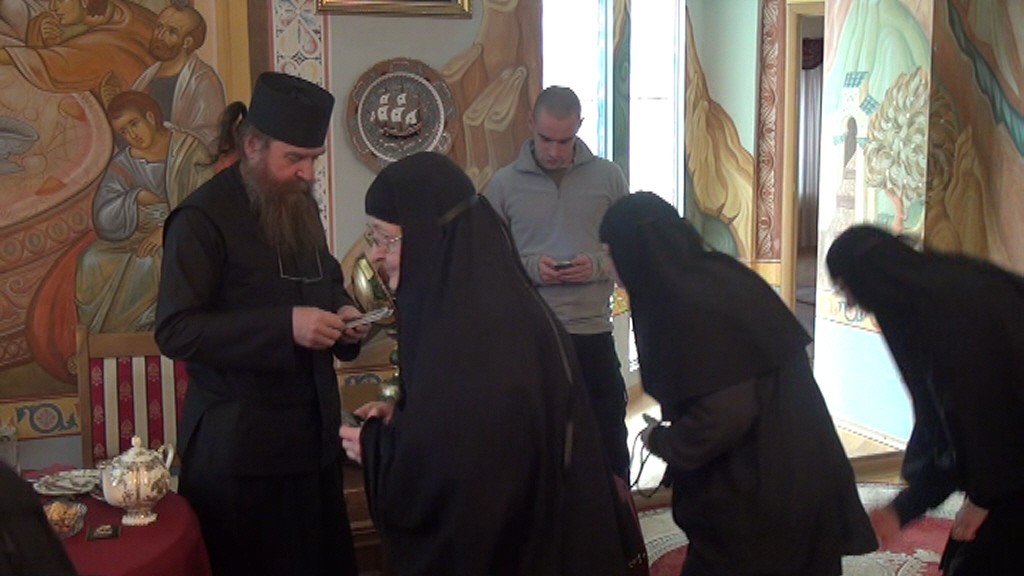 В архондарике монастыря состоялась Афонская встреча с насельницами монастыря, во время которой отец Никодим поделился опытом ведения духовной брани, основанной на святоотеческой традиции и монашеском предании, бережно хранимым на Святой Горе. На встрече были затронуты актуальные вопросы монашеской жизни обители: отец Никодим указал практические пути решения трудностей и искушений, с которыми сталкивается как монастырь в целом, так и каждая сестра в своем ежедневном монашеском подвиге. В беседе старец сказал, что, если на монастырь сильно нападает враг, значит, в монастыре ведется большая духовная работа, и отметил, что чем больше вражеские искушения, тем большую благодать и силу Бог даст монастырю в будущем. Геронда отметил: «Монастырю Ватопед, с которым у вас близкие духовные отношения, помогло пережить то тяжелое испытание последних лет, в котором оказался монастырь, именно единство братии и старца Ефрема. После этого вражеского нападения монастырь вырос, и это испытание еще больше сплотило братию вокруг своего старца».