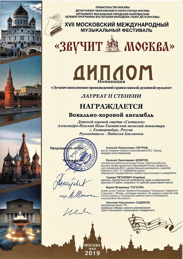 Детский хор «Светилен» певческой хоровой школы-студии, действующей при Александро-Невском Ново-Тихвинском женском монастыре г. Екатеринбурга, принял участие в Международном конкурсе хоровых коллективов «Звучит Москва». Хор существует под руководством преподавателя Н.Г. Баклановой.