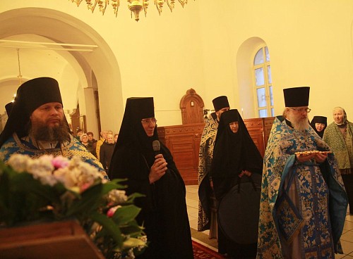 После чего Матушка игумения обратилась к епископу Николаю с приветствием, поблагодарила его за совершённое богослужение и преподнесла комплект орлецов.