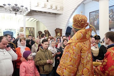 После заамвонной молитвы Его Преосвященство освятил артос, а также пасхальную снедь.