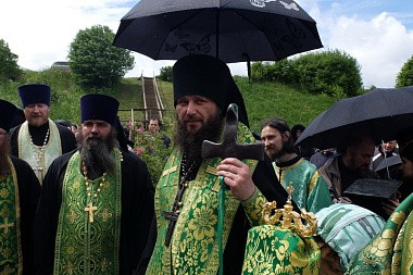 По окончании богослужения состоялся крестный ход по Никитской обители, затем он вышел за ее пределы и проследовал до святого источника преподобного Никиты Столпника, где состоялось освящение воды. Владыка Феодор весь путь нес на себе вериги прп. Никиты – святые реликвии, исцеляющие тех, кто поклоняется им с верой, – и на источнике осенял молящихся его крестом, являющимся частью вериг.