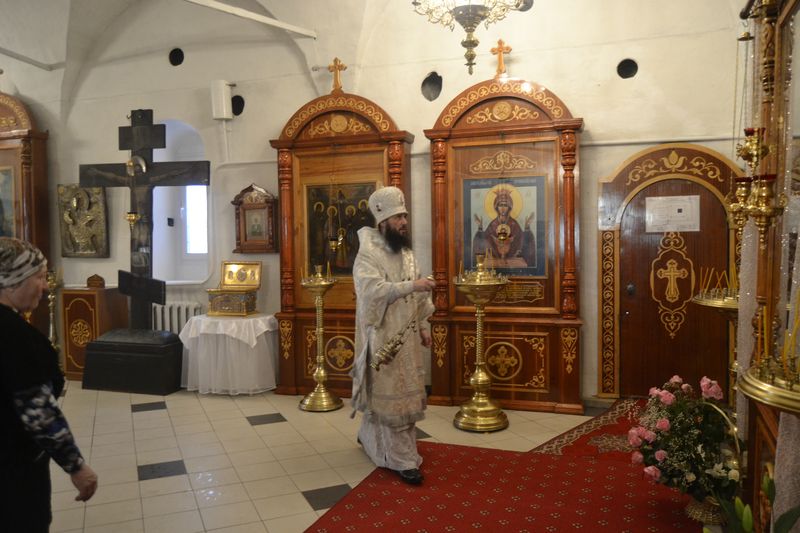 При открытых Царских вратах епископ Феодор коленопреклоненно вместе со всеми верующими просил Господа нашего Иисуса Христа ниспослать Пресвятого Духа и освятить храм и жертвенник сей. По окончании священнодействий престол облачили в двойные покрывала: нижнее белое, знаменующее собой погребальную плащаницу Спасителя, и верхнее украшенное, изображающее Его вечную Небесную славу.