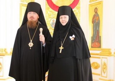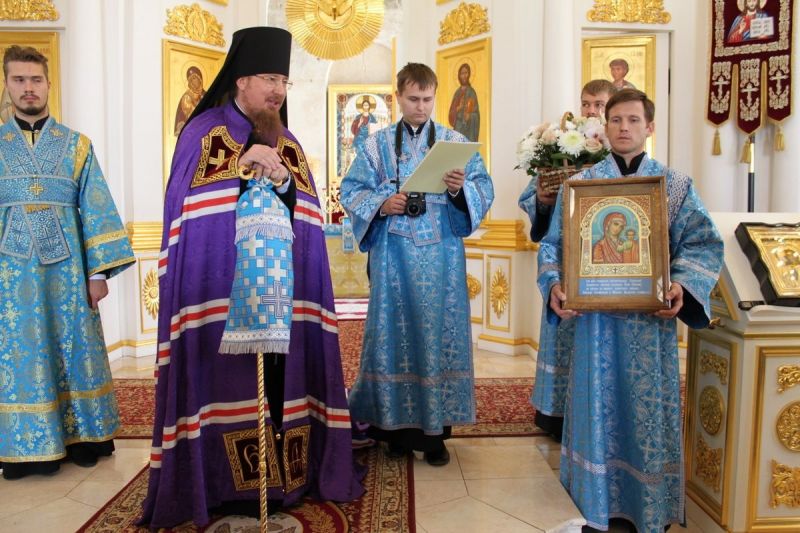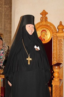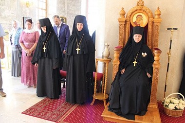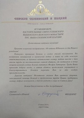 В завершение Преосвященный владыка поздравил настоятельницу монастыря игумению Веру (Ровчан) с 60-летним юбилеем и преподнес ей букет цветов и памятный подарок – икону Пресвятой Богородицы.
