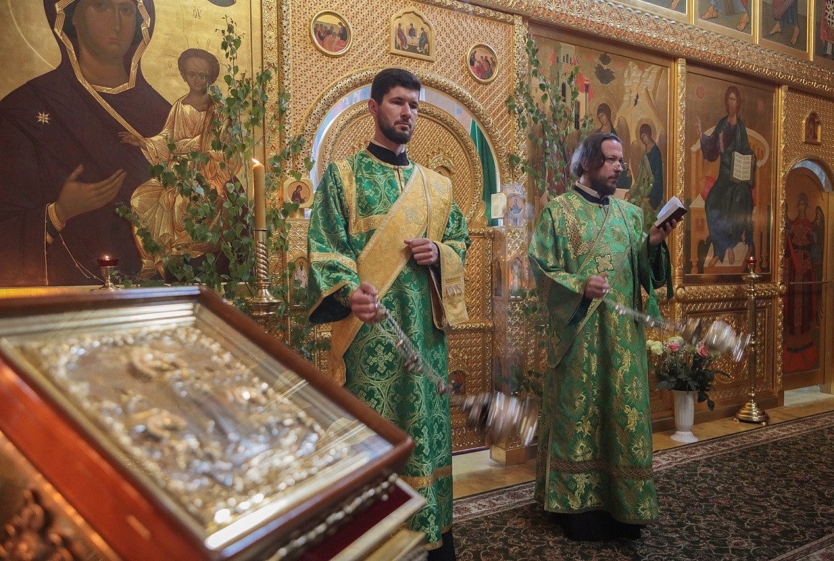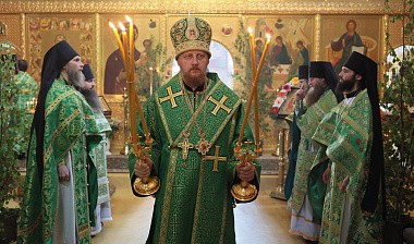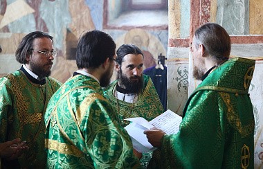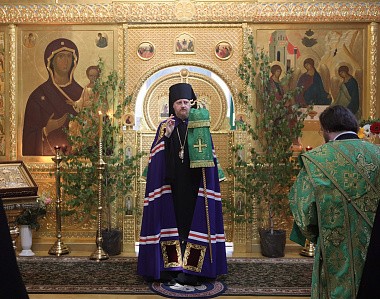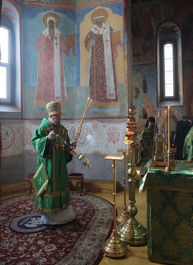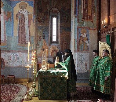 В Троицком соборе монастыря. Его Преосвященству сослужили настоятель обители игумен Пантелеимон (Королев) с братией в священном сане.