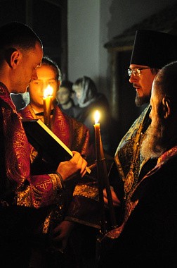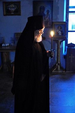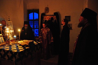 В алтаре молились насельники в духовном сане, священники и диаконы.