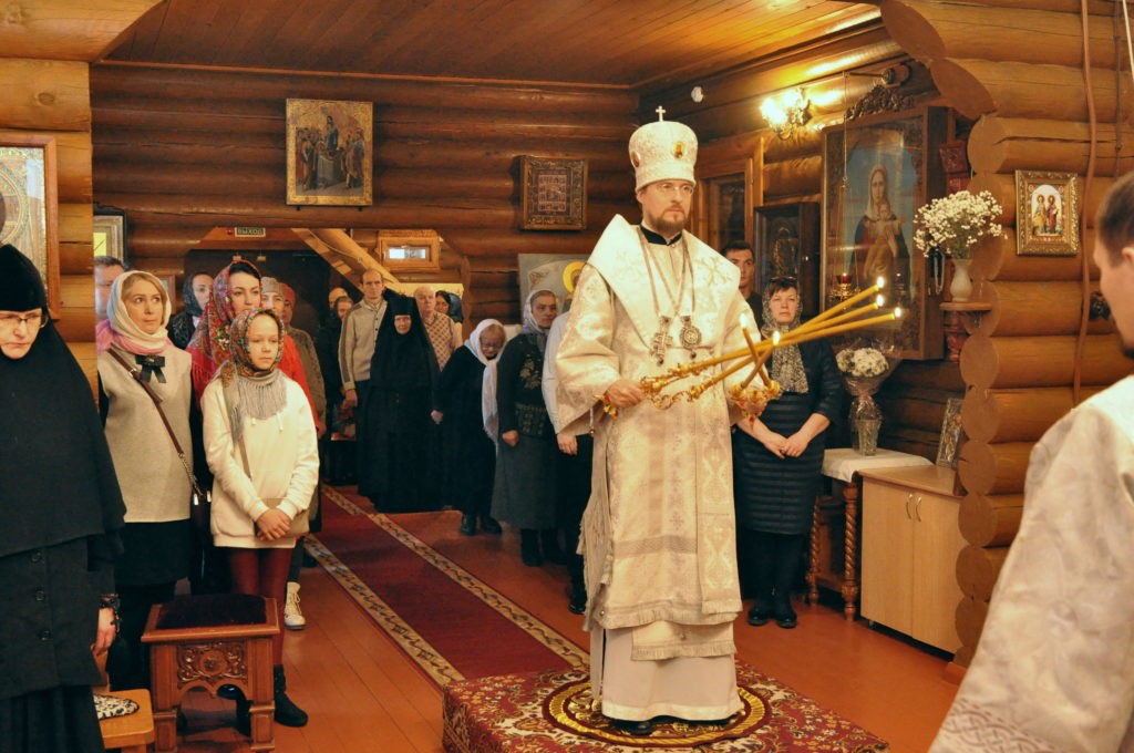 Преосвященного владыку встречали настоятельница монастыря игумения Кирилла (Червова) и насельницы обители.