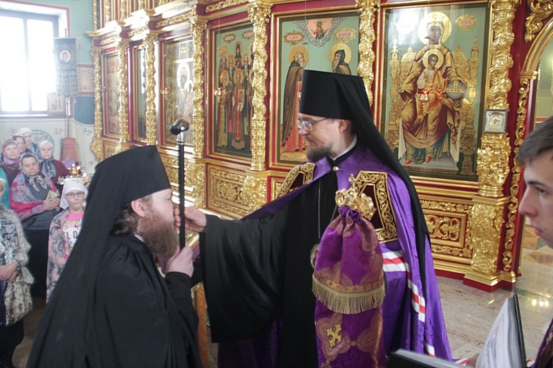 На малом входе правящий архиерей возвел иеромонаха Иова (Чернышева) в сан игумена Свято-Троицкого Филиппо-Ирапского мужского монастыря в пос. Зеленый Берег Кадуйского района.