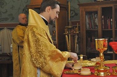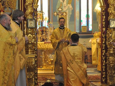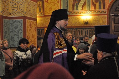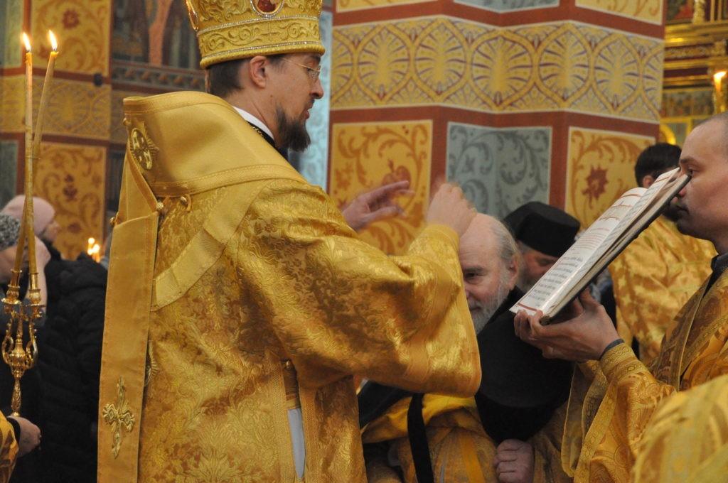 За Литургией Его Преосвященство совершил чин возведения иеромонаха Феодосия (Белова) в сан игумена мужского монастыря Троице-Благовещенская Евфросино-Синоезерская пустынь.