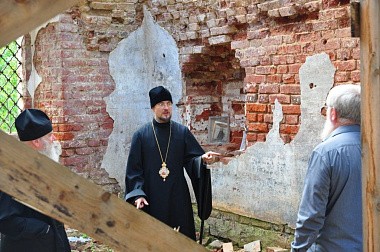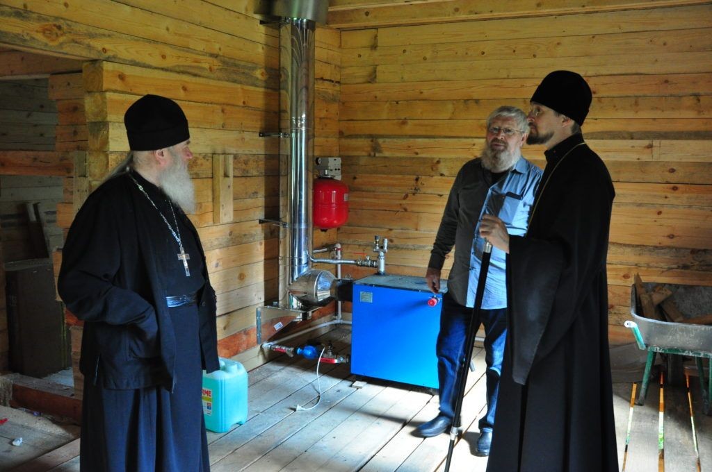 На месте строительства братского корпуса идут строительные работы, действует новая деревянная церковь. Владыка также осмотрел ремонтируемую каменную церковь Рождества Богородицы, поблагодарил трудников и пожелал им помощи Божией в этом богоугодном деле.