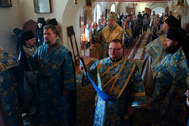 За праздничным богослужением Его Преосвященству сослужили: секретарь Александровской епархии иеромонах Даниил (Колесников), игумен Свято-Успенского Космо-Яхромского мужского монастыря Серафим (Котенев), игумен Богородице-Рождественской Лукиановой пустыни Тихон (Шибеко) и братия монастыря в священном сане.