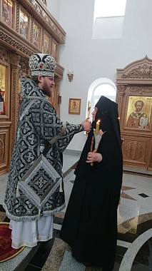 В храме во имя прмц. Елисаветы Феодоровны Его Преосвященству сослужили: благочинный Артемовского округа протоиерей Николай Трушников, клирик женского монастыря иерей Алексей Власов и клирик храма во имя пророка Илии г. Артемовского иеромонах Антоний (Юрьев).