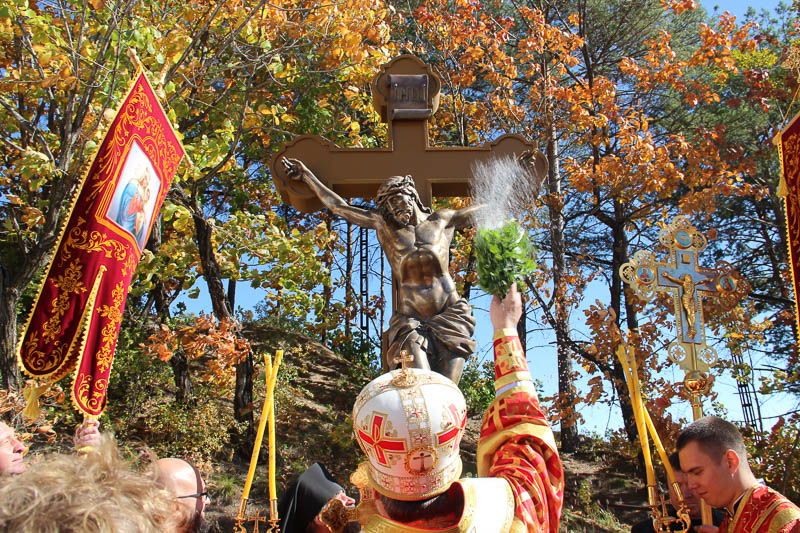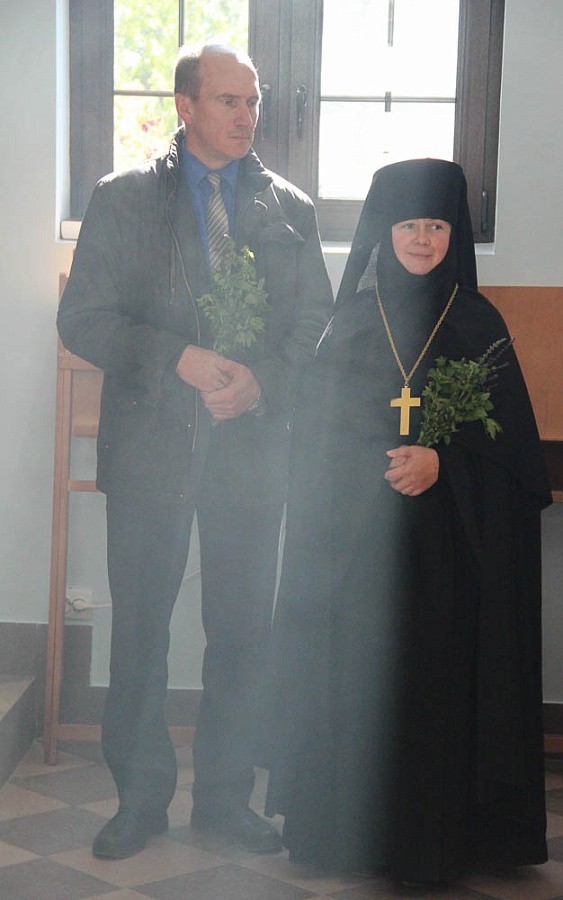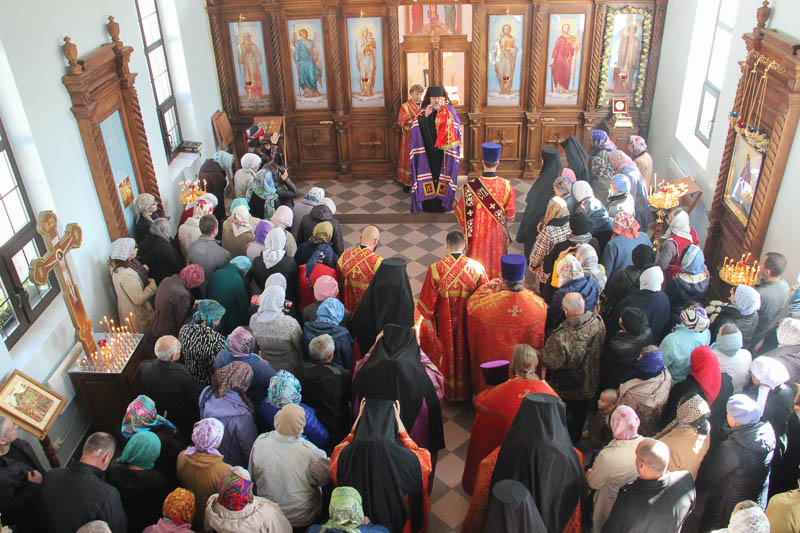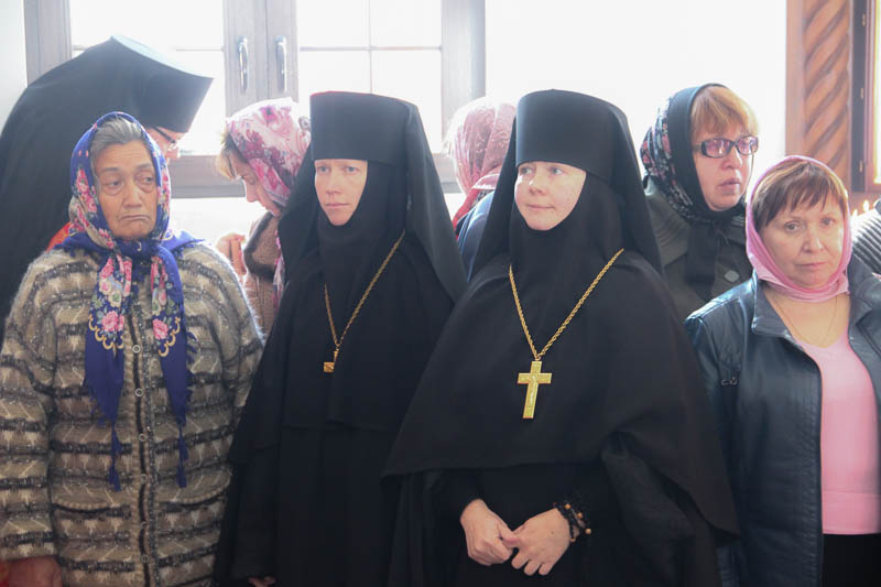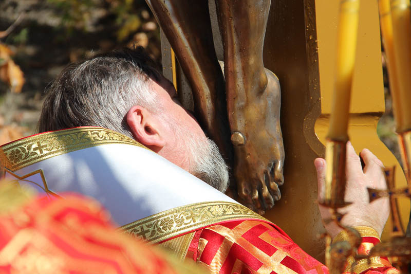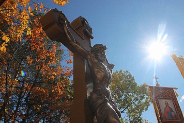 После причащения верующие совершили малый крестный ход и молитвенно поучаствовали в освящении поклонного креста на прихрамовой территории. Распятие высотой несколько метров со скульптурным изображением Спасителя, выполненным из металла, монастырю подарили благотворители из Санкт-Петербурга. Оно изготовлено по образцу старинного распятия в одном из соборов города на Неве.