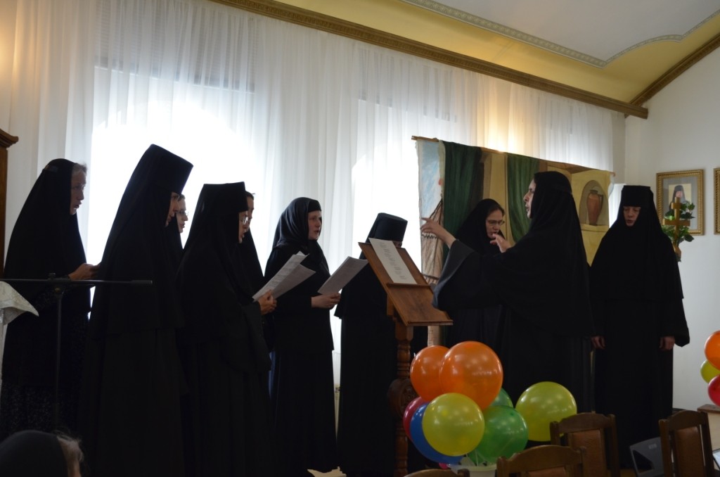 По окончании богослужения все паломники были приглашены на трапезу, во время которой матушку игумению поздравили сестры обители, исполнившие песнопения для всех гостей, и учащиеся Воскресной школы при монастыре, преподнесшие в подарок игумении Ольге спектакль, в основу сюжета которого было положено житие святой равноапостольной княгини Ольги.