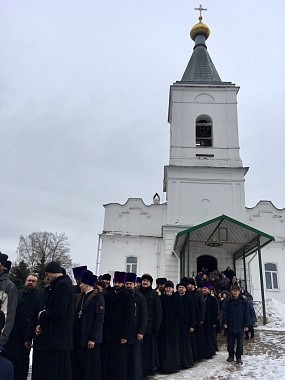 Его Преосвященству сослужили благочинный монастыря иеромонах Роман (Кулютин), благочинный Рославльского округа протоиерей Михаил Гольцман, благочинный Десногорского округа протоиерей Виталий Сладков, благочинный Починковского округа протоиерей Николай Бондар, благочинный Хиславичского округа протоиерей Роман Свистун, благочинный Гагаринского округа игумен Александр Карпиков, секретарь епархии диакон Николай Бондар, братия монастыря в священном сане, духовенство и клирики Рославльской, Смоленской и Вяземской епархий.