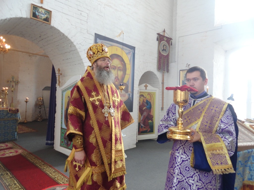 Его Преосвященству сослужили наместник монастыря иеромонах Арсений (Девятериков) и братия монастыря в священном сане.