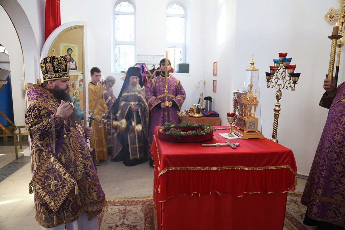 Накануне вечером правящий архиерей отслужил в монастырском храме всенощное бдение, за которым после великого славословия из алтаря в центр храма был изнесен Крест.