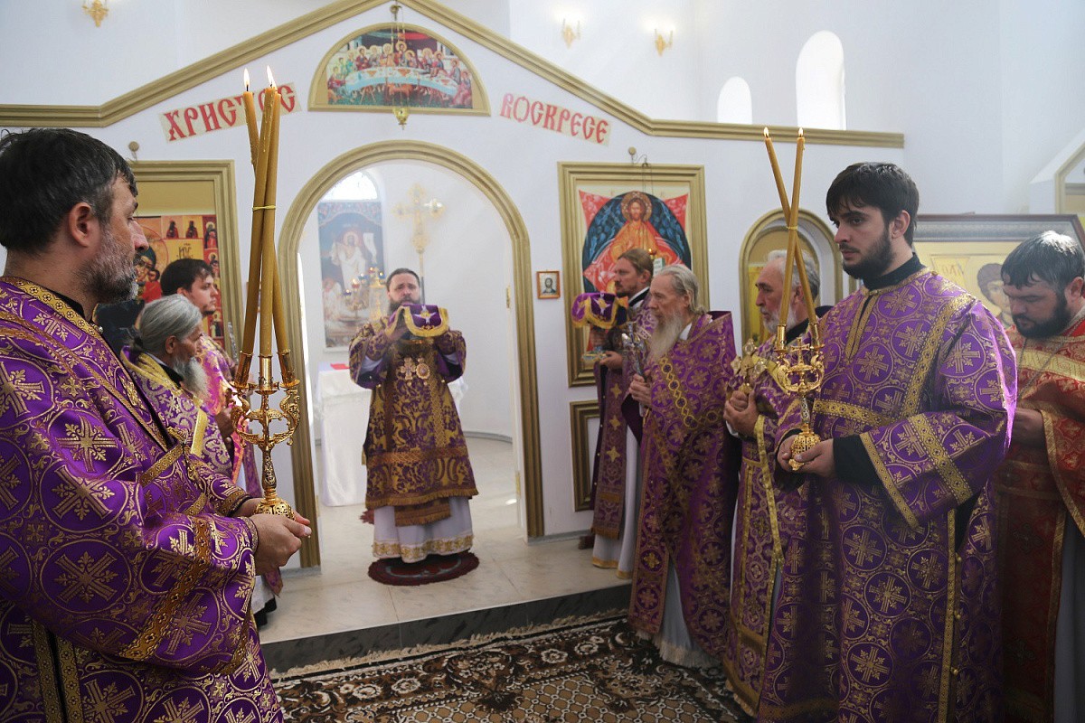 Его Преосвященству сослужили: секретарь епархии иеромонах Иоанн (Анисимов); благочинный Кизлярского церковного округа, настоятель Свято-Георгиевского собора в Кизляре иерей Павел Каликин; настоятель Казанского храма в пос. Комсомольский г. Кизляра иерей Сергий Лимонтинов; клирики Кизлярского благочиния, духовенство Свято-Успенского кафедрального собора г. Махачкалы.