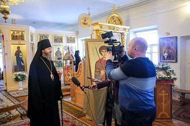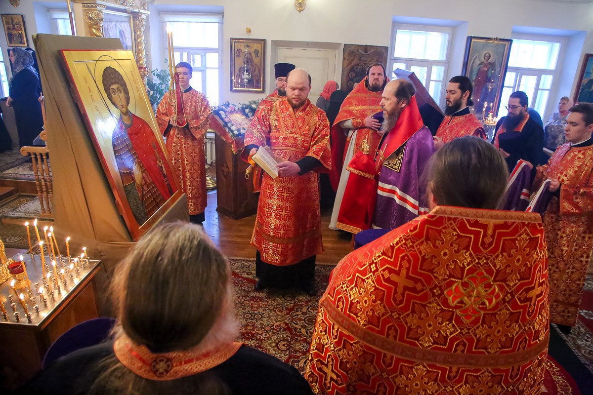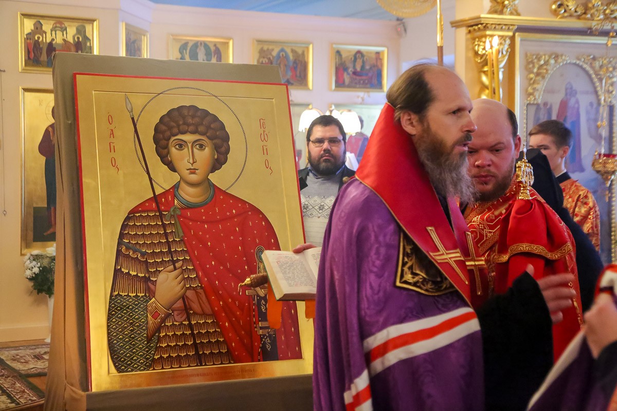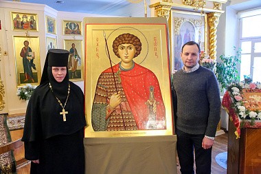 Перед началом богослужения состоялась торжественная встреча иконы небесного покровителя обители великомученика Георгия Победоносца. Это точный список новгородского образа конца XI – начала XII веков, который хранится в Успенском соборе Московского кремля. Икона создана по заказу одного из благотворителей обители на молитвенную память о его недавно умершем отце. «Наша семья связана с великомучеником Георгием очень тесно. Георгиями были мои дед и отец – так я назвал и сына», – рассказал Олег Кузьмин.