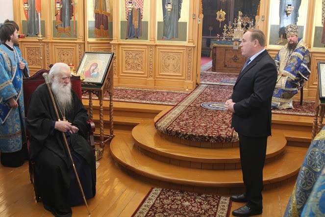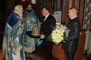 От лица благодарных жителей Кадома юбиляра приветствовал глава администрации Кадомский муниципальный район В.В. Щевьев и преподнес ему в подарок митру.