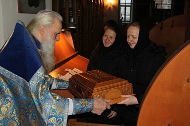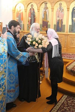 Игумения Иустина с сестрами обители пожелали о. Афанасию всесильной помощи Божией, здравия и спасения, крепости душевных и телесных сил на многая лета и преподнесли ему букет цветов и ковчег для святых мощей.