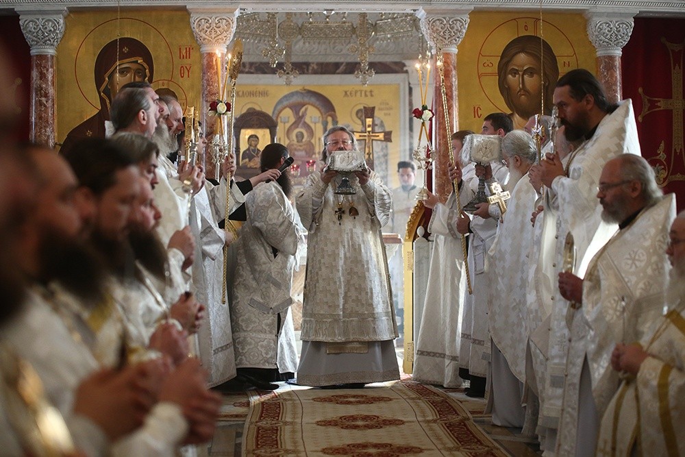 За литургией Его Высокопреосвященству сослужили многочисленные клирики Екатеринбургской епархии и архимандрит Ефрем с сопровождающей его братией монастыря Ватопед.