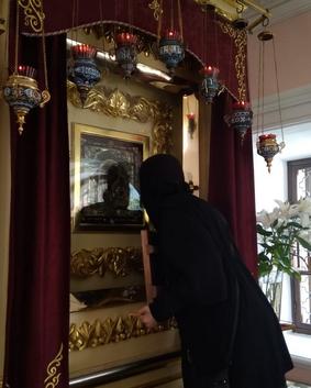 В святых местах сестры с молитвой освящают привезенный с собой список Казанской иконы Божией Матери. Этот современный список был выполнен по сохранившейся древней, в меру, прориси реставратором Свято-Троицкой Сергиевой Лавры Ириной Крипальской в 2017 году.