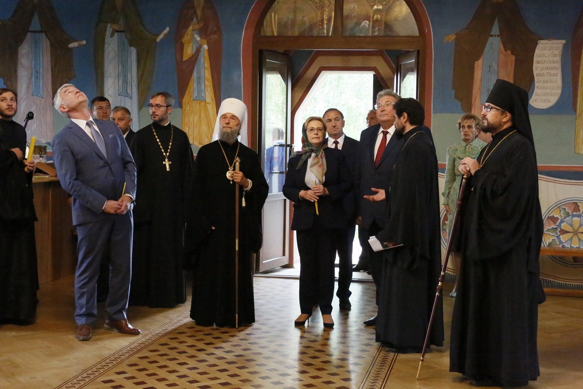 Затем гости прошли в Ближний скит обители. Митрополит Зиновий рассказал о нескольких храмах скита, после чего проводил Веронику Игоревну в келию старца схиархимандрита Феофана (Данькова) (+ 2013 год), в которой ныне организован его музей.