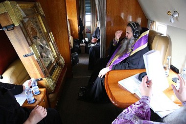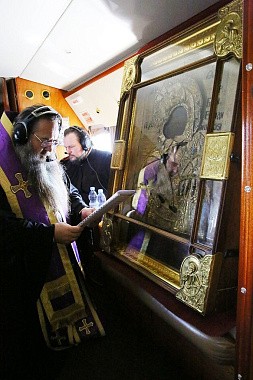 В полете глава Нижегородской митрополии совершил молебное пение во время губительного поветрия и смертоносной заразы с акафистом Пресвятой Богородице перед чтимым списком Владимирской-Оранской иконы Божией Матери из Оранского мужского монастыря.