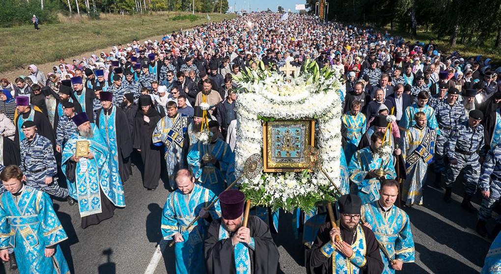 Когда под колокольный звон из собора вынесли икону Божией Матери «Знамение» Курскую-Коренную, архипастырь благословил святым образом Богородицы Курск на четыре стороны света и многотысячное шествие начало свой путь по центру города к Введенскому храму.