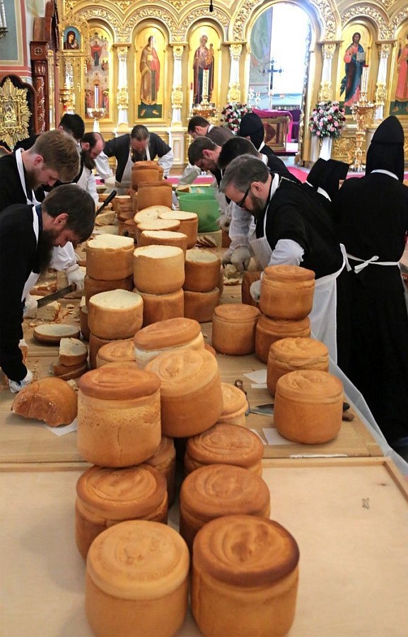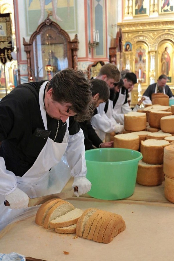 В раздроблении артоса участвовали только священнослужители. Им помогали старшие сестры – монахини и инокини, одетые в полное монашеское или иноческое облачение.