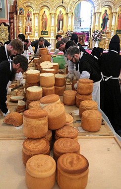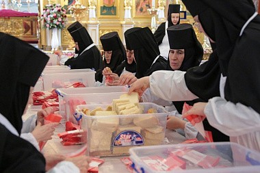 Всю Светлую седмицу на солее у отверстых царских врат во всех храмах Серафимо-Дивеевского монастыря стояли артосы. Каждый день по окончании Божественной литургии с ними совершались торжественные пасхальные крестные ходы по святой Канавке. Сегодня в Преображенском соборе перед вечерним богослужением клирики и сестры обители приступили к их раздроблению и упаковке.
