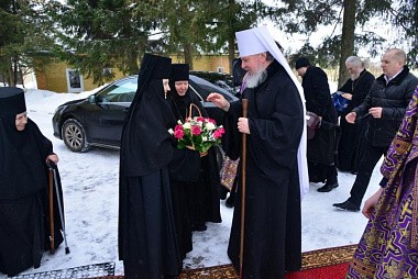 При входе в старинный монастырский храм в честь Воздвижения Креста Господня владыку Александра встречали настоятельница обители игумения Афанасия (Личаева) с сестрами.