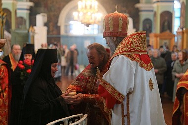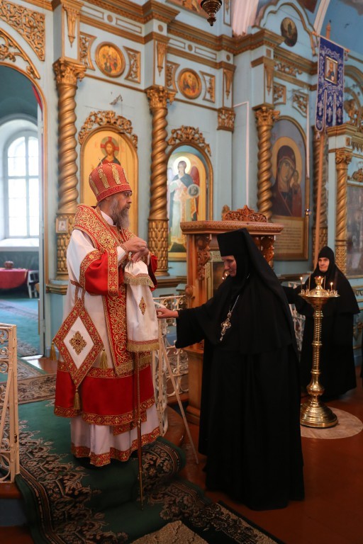 По окончании богослужения Владыка обратился к молящимся с архипастырским словом, за которым поздравил игумению обители с днем тезоименитства.
