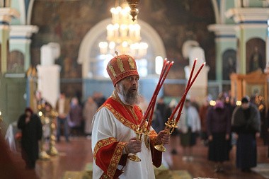 Его Высокопреосвященству сослужили благочинный монастырей Тульской епархии архимандрит Лавр (Тимохин) и клирик монастыря игумен Феодосий (Дамаскин).