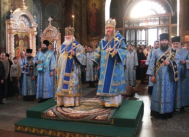 Митрополит Арсений подчеркнул, что не зря наши благочестивые предки в лихолетья и нашествия иноземных захватчиков смогли сохранить свои святыни, для которых последующие поколения воздвигли храмы, часовни и обители, в том числе и этот величественный Владимирский собор, что свидетельствует всем живущим о ходатайстве Матери Божией пред Богом за православный народ древнерусской земли.