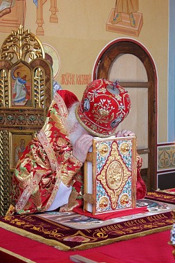 По заамвонной молитве владыка митрополит прочитал молитву на раздробление артоса.