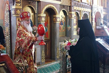 В завершение митрополит Арсений и игумения Зинона обменялись пасхальными яйцами.
