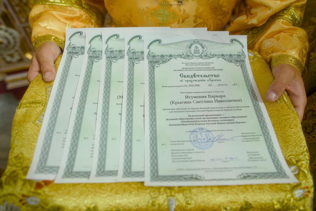 В этот день глава митрополии владыка Евгений вручил свидетельства о завершении курсов базовой подготовки в области богословия для монашествующих Русской Православной Церкви настоятельнице Благовещенского Борисоглебского женского монастыря поселка Краснояр игумении Варваре (Крыгиной), монахиням обители Нине (Крыгиной), Матроне (Машкинцевой), Феодосии (Борисовой), инокине Марии (Бондар). Сестры прошли обучение на базе Екатеринбургской духовной семинарии.