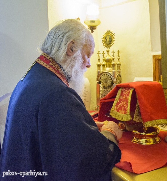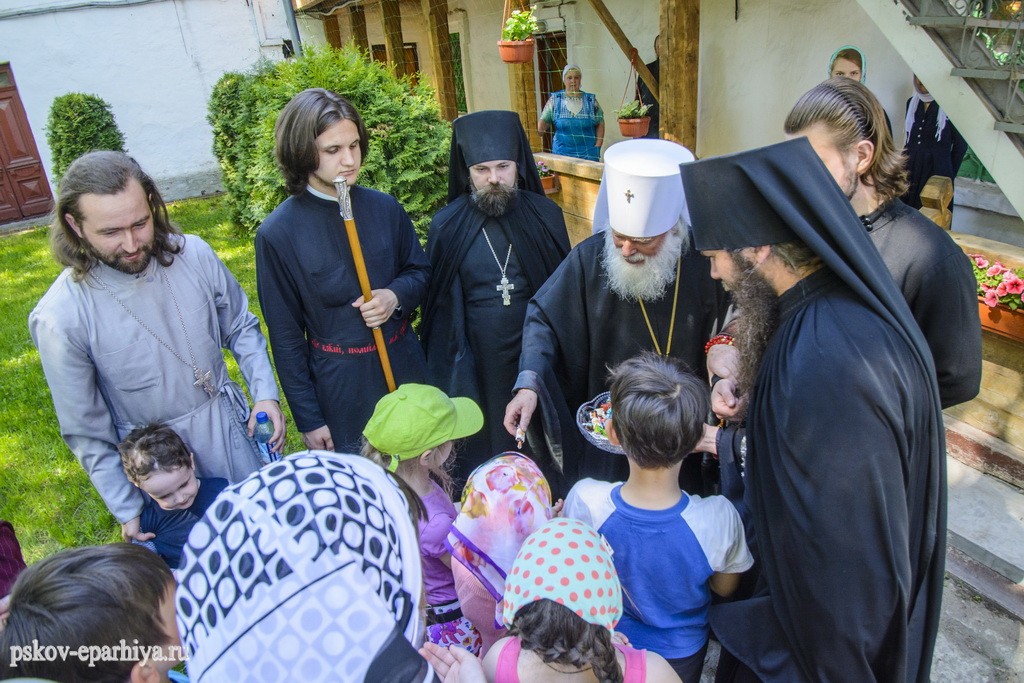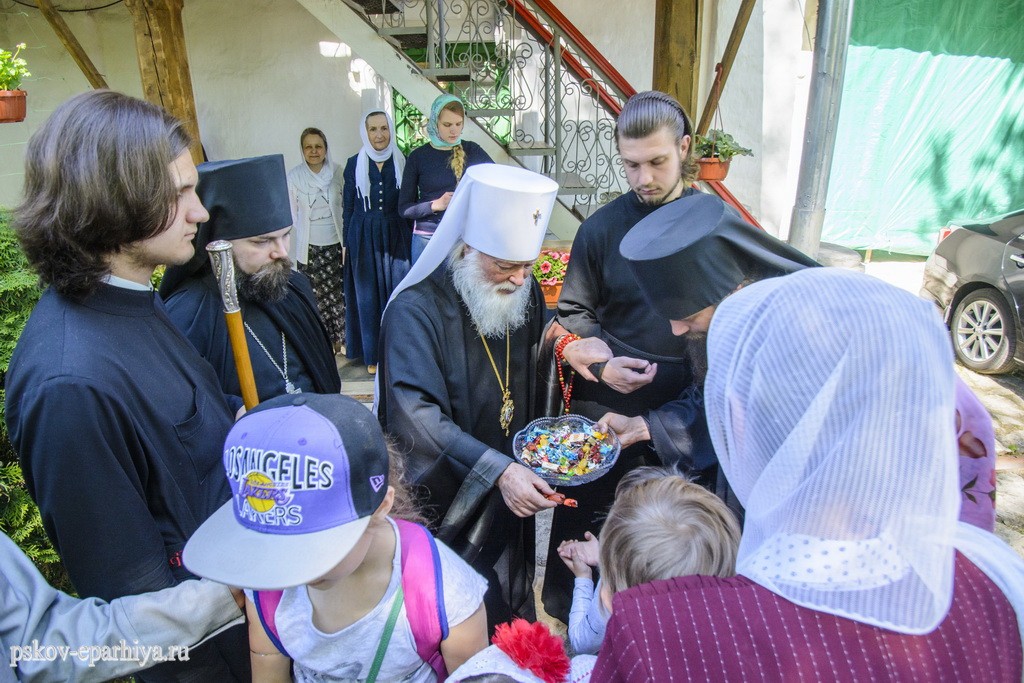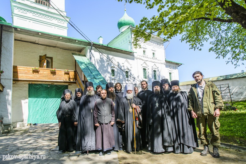 13 мая 2018 года, в Неделю 6-ю по Пасхе, о слепом, и день памяти святого апостола Иакова Зеведеева, митрополит Псковский и Порховский Евсевий молился за Божественной литургией в Спасо-Преображенском Мирожском мужском монастыре.