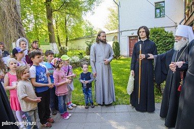 В завершение владыку митрополита с праздником Светлого Христова Воскресения поздравили преподаватели и учащиеся Воскресной школы храма Святых жен-мироносиц г. Пскова во главе с настоятелем священником Александром Николаевым. Псковский архипастырь поздравил детей с праздником и вручил им сладкие подарки.