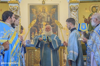 Его Высокопреосвященству сослужили епископ Гдовский Фома, викарий Псковской митрополии; протоиерей Александр Тимофеев, настоятель храма Успения Божией Матери пос. Струги Красные, а также местное духовенство.