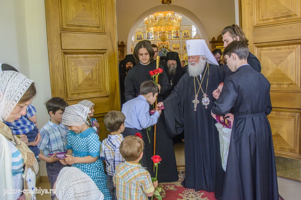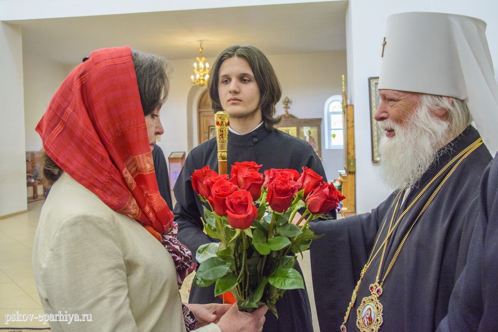 Его Высокопреосвященству сослужили епископ Гдовский Фома, викарий Псковской епархии, наместники монастырей митрополии, руководители епархиальных отделов, благочинные церковных округов, настоятели и клирики храмов Псковской митрополии.